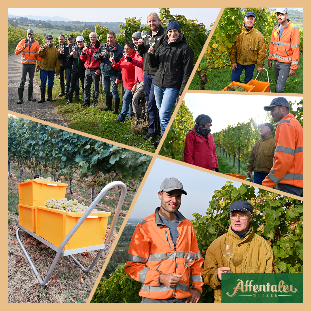 Heute wird seit den frühen Morgenstunden im Gewann Wolfhag, mit rund einem Dutzend eifrigen Helfern aus dem Freundeskreis und der Familie Riesling, Selektion gelesen. Eine Selektionsanlage muss besondere Voraussetzung erfüllen. Zum einen eine Lage mit Ausrichtung nach Süden, nur alte Reben haben das Privileg der Selektion und die Trauben werden auf 50-60 kg / Ar reduziert. Ein erheblicher Mehraufwand, der sich aber in Qualität und Aromatik der Trauben deutlich bemerkbar macht. Seit 10 Jahren liefert der Familienbetrieb die exzellenten Trauben für den charakteristischen Riesling SLK. Natürlich ist nicht jedes Jahr wie das andere, wir Winzer stehen immer neuen Herausforderungen gegenüber. Wie auch in diesem Jahr, wo Frost und Regen uns zu schaffen machten. Auch auf den Klimawandel müssen wir uns einstellen, konkretisiert Fabian.