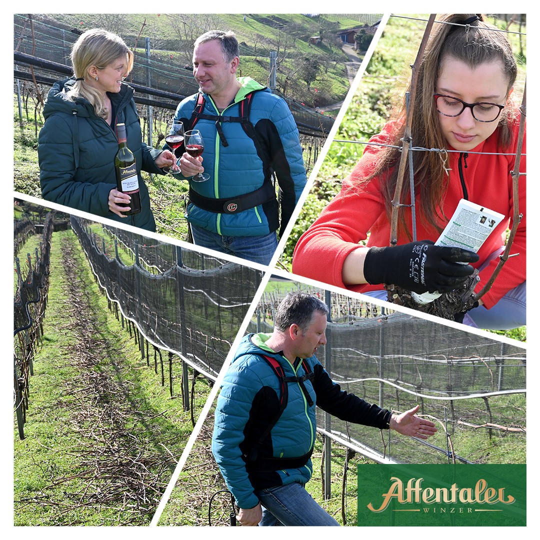 Gerhard Vollmer ist ein zukunftsorientierter und innovativer Winzer. Er hat in den letzten Jahren viel in neue Rebanlagen investiert und möchte auch zukünftig am Puls der Zeit bleiben. So war er einer der ersten Winzer der Region, der seine Reben mit einem Whailexsystem ausgestattet hat. Dieses Netzsystem dient sowohl zur Arbeitserleichterung für Heft.- und Steckarbeiten, gegen Wildverbiss, Vogelfraß als auch zum Hagelschutz. Zudem bleibt er flexibel für andere Arbeiten im Hinblick auf die Bewirtschaftung der Obstanlagen, erklärt Gerhard Vollmer. Dass die Vollmers auch gerne den Affentaler Wein genießen ist keine Frage, am liebsten fruchtig & feinherb verrät seine Frau Corinna, die vor einigen Jahren schon die Ausbildung zum Wein-Guide absolviert hat und sich bestens mit Wein auskennt. Bei der Frage welche Arbeiten im Weinberg am liebsten verrichtet werden, sind sich alle einig: Das Herbsten! Dann hoffen wir schon jetzt auf eine gute Weinlese, die Weichen dafür sind ja bereits gestellt.
